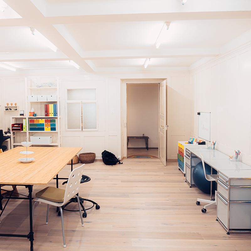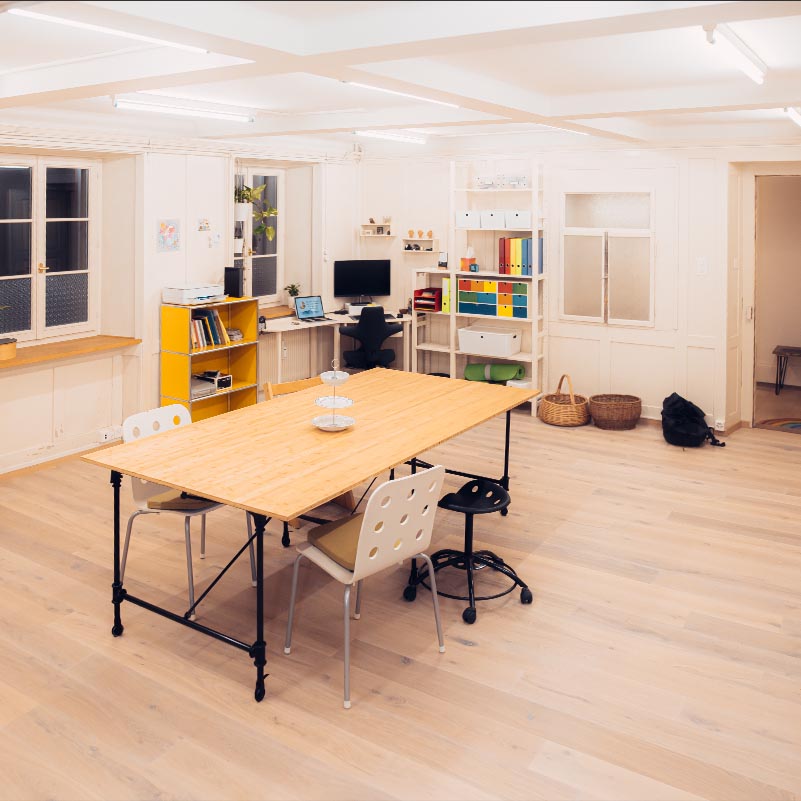 Im Atelier gibt es viele Möglichkeiten zum Arbeiten, Malen, Gestalten und Bewegen.
